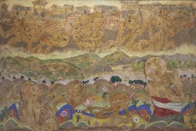 1부 ‘향토(鄕土) - 빼앗긴 땅’에서는 일제강점기 우리 땅을 그린 각 지역의 풍경화를 통해 제국주의시대 우리 땅에 대한 인식을 살펴본다. 이 시기 ‘향토’는 일본의 식민주의적 시각으로 조선을 문명에 물들지 않은 평화롭고 순수한 전원의 풍경으로 표현하는 ‘향토색’회화가 유행과 동시에 논쟁의 중심에 있었다. 하지만 ‘향토’를 민족 정서를 고취하는 공간으로 인식하고 우리 땅이 품은 고유의 색을 발견하려는 민족의식과 함께 경성‘녹향회’의 오지호·김주경과 같이 빛과 색채의 다채로운 변화를 통해 진정한 조선의 자연을 표현하려는 작가들도 존재했다. 또한 대구‘향토회’, 부산 ‘춘광회’, 광주 ‘연진회’, 제주‧호남 화단 등 각 지역에서 활동한 화가들의 풍경화는 각기 다른 풍토와 경관을 보여준다. 일제강점기 우리 땅에 얽힌 복잡한 시선을 담은 작품들, 민족 저항시인 이상화의 강렬한 시구를 비롯, 향수를 노래한 정지용, 백석, 이용악, 오장환 등의 시와 유네스코에 등재된 독립운동가들의 만주망명 가사들을 함께 선보인다. 이들 자료와 미술작품을 함께 선보이며 당대 문화예술에 내재한 고향의식의 공통된 모습을 찾아본다.