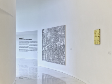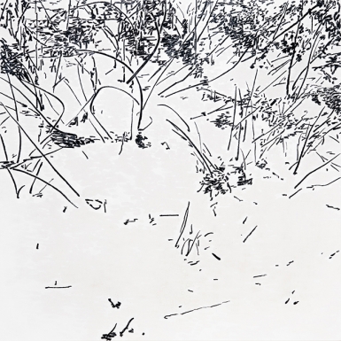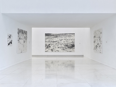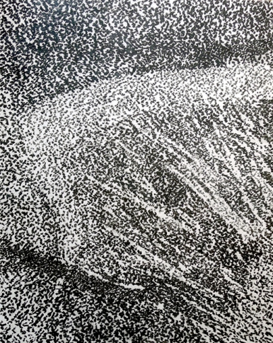 아울러 「섬성 Islandness」(2022)에서 작가는 일상 속 인공 구조물에서 나타난 현상을 채집했다. 버스 정류장의 유리 지붕에 고인 빗물과 증발 후 남은 침전물이 작품의 모티프가 되었다. 생태계를 이루는 작은 섬처럼 보이는 화면을 들여다보면, 이는 흰 바탕에 불규칙하게 찍힌 점들의 집합체라는 것을 알 수 있다. 관람자는 작가가 새긴 흔적을 단일한 이미지가 아닌 시간과 생태 흐름이 어우러진 장면으로 경험하게 된다.