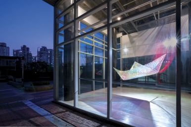 전시장 안을 부유하는 투명한 종이배는 시간과 빛에 따라 변모합니다. 낮에는 유리를 통과한 자연광을 받아 더욱 반짝이고, 밤에는 반사되는 빛에 의해 어둠 속에서 강렬한 존재감을 드러냅니다. 이 반짝임은 시작과 끝의 경계를 지나는 모든 생명에게 보내는 찬사이자 응원이며, 끝맺음을 향한 여정이 찬란하고 아름다울 수 있기를 바라는 작가의 마음을 담고 있습니다.