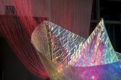 김선경 작가는 종이배 모형을 비닐 테이프 같은 투명 소재를 이어 붙이는 지난한 공정을 거쳐 완성한다. 조형적 재료로 비닐을 채택한 목적은 분명하다. 우선 내구성을 가져 구조적으로 견딜 수 있을 뿐 아니라 빛을 투과시키면서 다양한 빛깔의 변화를 만들어 내고 그림자까지 투영해 낼 수 있기 때문이다. 그의 모형 종이배가 조각이면서 마치 부피가 없는 이미지처럼 환영을 느끼게 하는 원인이기도 하다.