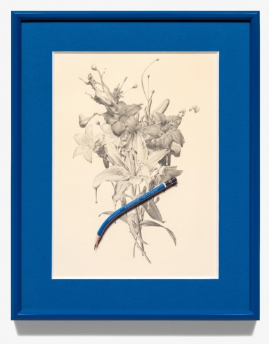 Study of Flowers, 2025, UV cured print and graphite on yellow-brown prepared paper,, 36.3 × 26.7 cm