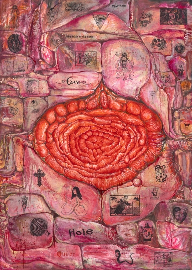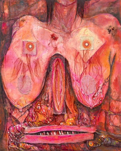 Gore Deco – The Origin of the World, 2025, Oil, oil pastel, silkscreen, transfer print on linen 227.3 x 162.1 cm Courtesy of the artist and Kukje Gallery 사진: 안천호 이미지 제공: 국제갤러리