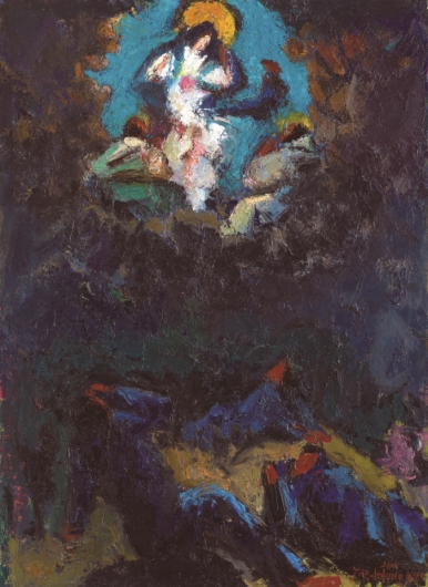 김재형의 회화는 가톨릭 신앙을 중심으로 전개되며, 성경의 이야기는 정형화된 종교적 도상에 머물지 않고 작가의 사유를 거치며 남도의 풍경과 일상의 정서 속으로 스며든다. 그의 작업에서 신앙은 삶과 예술의 근원으로 자리하며 화면은 묵상과 찬미가 축적된 영성의 공간으로 확장된다. 한편 정승주는 설화를 매개로 인간의 감정과 관계, 삶의 모습을 탐구해 왔다. 그는 이야기의 전개를 설명하기보다 상징적 형상과 화면 구성에 집중하며, 설화에 담긴 정서와 긴장을 조형적 질서로 전환해 자신만의 회화 언어로 발전시켜 왔다.