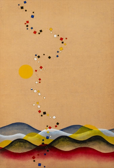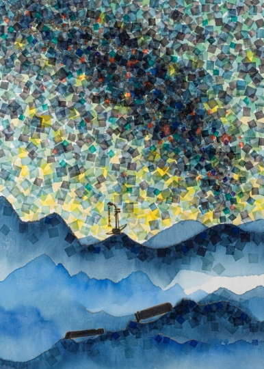 그림에 등장하는 축적된 정간은 색의 밀도 속에서 오방색과 어우러지며 하나의 풍경처럼 펼쳐진다. 수묵의 층위는 시간의 흐름과 공간의 깊이를 동시에 은유하며, 고정된 실체를 드러내기보다 생성과 소멸의 과정을 은유한다.