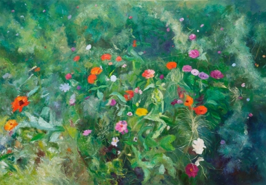 이러한 세계는 정돈된 질서 속에서가 아니라 인위적인 구조가 느슨해진 틈에서 생성된다. 들꽃이 경계 없이 얽히고 빛과 바람이 예측 없이 스며드는 순간, 작가는 형태 이전의 움직임을 감각적으로 포착한다. 화면에 남은 색채의 층위는 완성된 풍경이라기보다 자연의 맥동이 지나간 흔적이며, 자연을 경험한 감성이 물성으로 남은 결과라 할 수 있다.