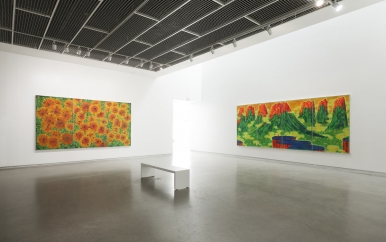 같은 주제의 <응시가 극본이 되었을 때(当凝望成为剧本)>은 솟아오른 봉우리의 강렬한 주황색과 붉은색과 극적인 대조를 이루는 녹색의 산맥이 거대한 화면을 빼곡하게 채우고 있다. 가운데 전통 복장을 한 인물이 청색의 절벽 위에서 이 웅장한 자연을 감상하고 있다는 점에서 이 작품은 대경(大景) 산수인물화를 떠올리게 만든다. 이 풍경은 현실의 자연을 묘사했다기보다는, 내면의 풍경이나 격렬한 감정이 응축된 환영적인 산수에 가깝다. 그러나 작품은 산수화와 전혀 상관없다. 단지 산수화의 구도만 가져온 이 작품의 화려한 색채와 마치 유리구슬처럼 투명한 원들이 불러일으키는 신비로운 분위기에도 불구하고, ‘쓸쓸함’이 느껴지는 것은, 이 풍경이 실제 우리가 발 딛고 선 세계가 아닌, 고립된 몽환(夢幻)의 공간이기 때문이다.