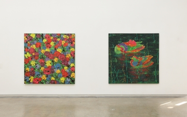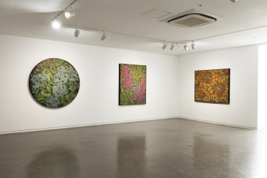 그가 왜 부수는 작업에 천착하고 있는지를 파악하기 위해 이 세 연작의 대표적인 작품을 중심으로 고찰할 필요가 있다. 먼저 ‘파각’ 연작에 속하는 <파각-수많은 깨달음(万仟菩提)>을 보면 붉은색 계열의 꽃잎과 원으로 이루어진 녹색의 형태가 화면을 가득 채우고 있다. 그런데 꽃잎의 붉은색도 수많은 원과 점으로 가득 채워진 까닭에 보색이 주는 시각적 자극과 함께 화면 전체를 현란한 빛과 색의 축제로 이끄는 듯하다. 심지어 꽃잎과 녹색 원반 사이의 짙게 칠한 부분도 무수하게 많은 색점들로 구성되어 있어서 공간의 깊이나 원근은 사라지는 대신 화면은 균질한 평면으로 환원하고 있다. 점 하나는 물론 형태의 윤곽을 결정하는 선까지 섬세하게 그리는 엄청난 공력에도 불구하고 결과는 매우 디지털적이다. 그러나 디지털의 기계적 공정이 만들어낸 건조한 결과와 달리 그의 작품은 거의 수행에 가까운 집요한 노동의 산물인 까닭에 생명의 숨결을 지니고 있다. 근접 촬영한 꽃을 묘사한 것 같지만 세포 하나까지 놓치지 않으려는 집요함에서 볼 수 있는 공예적 기량과 장식성이 만들어낸 이 작품은 뜻밖에도 초현실적 풍경을 보여준다. 꽃잎의 중심마다 그려 넣은 눈은 불화(佛畫)의 부처나 보살의 눈을 연상시킨다. 이 눈은 우리를 화려한 화면 속으로 빨려들도록 이끈다. 다른 관점으로 보자면 그림 속 응시하는 눈에 의해 우리의 존재가 노출되고 있다는 생각을 가지게 만들기도 한다. 기묘한 긴장감을 불러일으키는 꽃의 아름다운 장식성 이면에 숨겨진 수많은 ‘응시’는, 존재의 근원적 쓸쓸함과 인식의 무한한 확장을 동시에 시사한다.