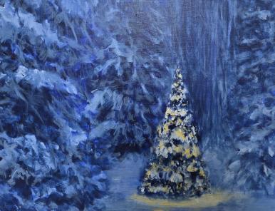 작업 속 숲은 차가운 파란색으로 이루어져 있습니다. 이 색은 단순한 밤의 색이 아니라 소리가 가라앉은 겨울밤의 공기와 같은 ‘차가운 고요’를 담고 있습니다. 그 고요 속에서 숲은 자유롭지만 동시에 무엇이 나타날지 알 수 없는 긴장을 품고 있습니다.