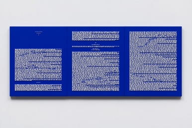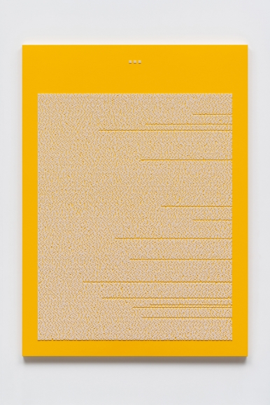 - 고산금 작가는 소설이나 철학서의 텍스트를 시각적 이미지로 치환하는 독창적인 작업을 보여준다. 문장을 인공 진주로 바꾸는 반복적인 수작업을 통해 기존의 의미를 지우고, 그 자리에 남은 밀도와 리듬을 통해 새로운 감각적 풍경을 제시한다.