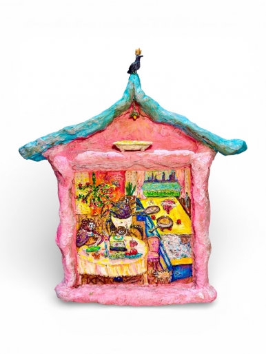 작업의 출발점은 늘 드로잉인데 이 드로잉은 계획된 스케치가 아니라 감정과 기억, 생각의 흐름 속에서 시작된다. 선과 덩어리 속에서 발견된 이미지들은 잘리고 다시 배치되며 새로운 장면을 형성한다. 종이 조각들은 구겨지거나 접히고 글루건을 통해 화면 위에서 입체적인 구조를 만든다. 이러한 방식은 회화와 조각의 경계를 넘나드는 ‘회화적 조각(painterly sculpture)’의 형식으로 나타난다. 이렇게 만들어진 화면은 콜라주이면서 동시에 얕은 조각적 구조를 가지며 하나의 작은 무대이다. 관람자는 그 장면을 들여다보는 관찰자가 된다.