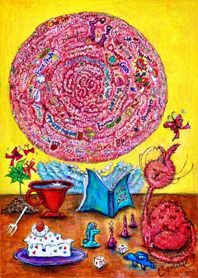 작품의 장면들은 밝고 강렬한 색채와 큐빅과 같이 반짝이는 장식적 요소로 구성되면서도 그 안에는 삶과 죽음, 불안, 존재에 대한 질문이 함께 놓여 있다.