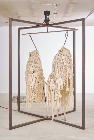 ↔, 2018, 강관, 밧줄, 직류 전동기, 끈, 알루미늄 체인, 230×140×140cm. 이미지 ⓒ 유지오 2018, 작가 제공