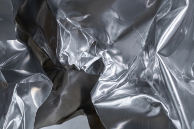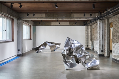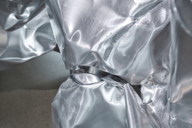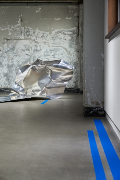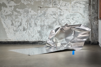 단 3점으로 전시장을 가득 채우고 있는 작품 〈Flat Hunter〉는 언뜻 누군가 던져둔 구겨진 종이처럼 보이기에, 거대한 크기가 갖는 존재감은 가볍고 유동적인 감각을 동시에 자아내며, 독특한 분위기를 보여준다. 이 작품은 공사를 위해 뒤집은 땅의 흙더미에 알루미늄판을 두고 그 언덕이 평평해질 때까지 굴삭기의 힘으로 내리쳐가며 만든 작품이다. 그렇기에 조각은 모래가 빠져나간 흔적처럼 존재한다. 반짝이는 알루미늄의 화려함을 뒤로한 채 조각의 외형을 천천히 살펴보면, 우리는 그 표면에서 날 선 모양으로 접힌 부분, 그리고 뚫리거나 긁힌 무수한 스크래치를 발견하게 된다. 이 흔적들은 애초의 모래언덕이 어떤 형태였을지, 그리고 언덕을 평평하게 하기 위해 얼마만큼의 힘이 가해졌는지를 직관적으로 보여준다. 〈Flat Hunter〉의 제작에서 작가는 산업용 규격에서 가장 큰 사이즈의 알루미늄판을, 그리고 기존에 사용하던 망치가 아닌 인간의 힘을 능가하는 굴삭기의 힘을 빌려온다. 작가의 굴삭기는 문명을 창출하는 인간의 행위를 모방하듯 눈 앞의 거친 땅을 평평하게 하지만, 그와 동시에 그 생성물인 알루미늄 조각을 오류의 덩어리로 만들어 버린다.