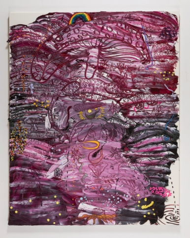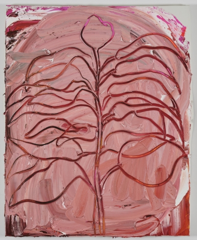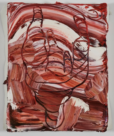 이러한 형상들의 결합은 색채와 물질성의 차원에서 더욱 강조된다. 그의 회화에는 적색 계열의 물감이 주를 이루며 광택이 살아 있는 표면은 때때로 날것의 육체를 연상시킨다. 여기에 간헐적으로 등장하는 초록, 보라, 노랑은 시간의 흐름에 따라 변화하는 유기체의 표면을 암시한다. 가와우치는 캔버스 위에 안료를 거칠게 얹고 밀어 올리듯 화면을 구성한다. 서로 섞이지 않은 색의 덩어리들은 층을 이루며 지층처럼 축적되고, 두터운 마티에르는 살아 있는 유기체의 생명력을 물질적 밀도로 드러낸다. 이러한 과정에서 작가는 화면의 저항을 감지하며, 의식에 앞서 손이 반응하듯 물감을 긁어낸다. 물감의 점성과 굳는 속도는 작가의 개입을 제약하고, 더 이상 개입할 수 없다는 감각이 감지되는 순간 손은 멈춘다. 가와우치는 최근 작업에서 이미 굳은 물감층 위에 색을 얇게 덧입히거나, 튜브에서 물감을 직접 짜 올리는 방식을 병행한다. 처음의 거칠고 두터운 붓질과 달리, 물감층을 얇게 긁어낸 자국 위로 형태를 채우는 섬세한 붓질이 한 화면 위에 공존한다. 이처럼 얹고, 긁어내고, 덮어씌우는 서로 다른 제스처와 속도의 대비는 화면에 시각적 긴장감을 형성한다.