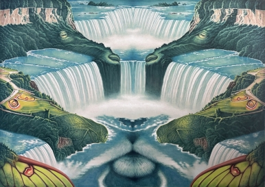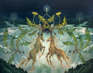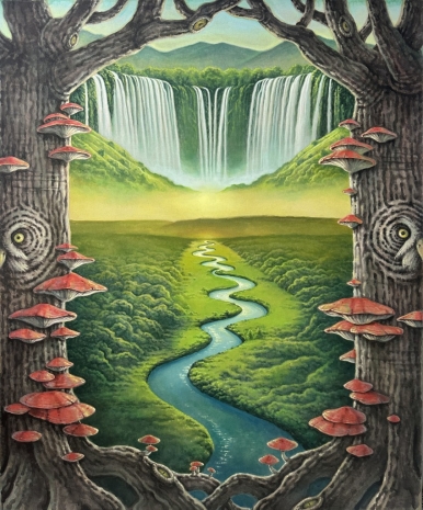 먼저 그의 그림을 살펴보자. <뉴 에이지 나이아가라 1>, <뉴 에이지 나이아가라 2>의 폭포 주변의 모습이 뭔가 이상하다. 양의 눈과 코와 입의 모습이 보이고 다른 한편엔 나방의 날개 문양으로 이루어진 들판이 나타난다. 그뿐만 아니라 <부엉이 교향곡 1>, <부엉이 교향곡 2>에는 나무 그 자체가 부엉이이고 그 위로 버섯들이 자라고 있다. <거울 회랑 1>, <거울 회랑 2>에는 역동적인 말의 모습을 한 민들레 뿌리가 등장한다. <거울 정원 1>, <거울 정원 2>, <소실점>에서는 고사리, 버섯, 민들레 홀씨 같은 식물이 확대되어 거대한 구조물같이 자리 잡고 있다. 대지와 하늘은 마치 하나의 생명체 같고, 나무는 동물과 버섯이 공존하는 토대이고, 식물은 역동적인 동물과 같은 모습, 혹은 거대한 건축적 구조를 이룬다. 사실 이들은 그의 작업에 이미 종종 등장했던 동식물이다. 하지만 이번에 작업에서 이들은 개별적 성격을 드러내기보다는 서로에게 물들고 스며든 것 같은 동질화된 모습으로 나타난다. 이렇듯 그가 그리는 풍경은 자연의 신비로운 풍경을 그려내면서도 그 속에서 찾아볼 수 있는 다양한 생명체의 모습이 주는 은밀한 매력으로 인해 마치 우리의 손길이 닿지 않은 그들만의 세상인 것 같이 보인다. 이처럼 그가 상상하는 세상은 전혀 우리와 관계없이 어느 순간 갑자기 나타난 결과물과 같은 모습이다. 우리는 이곳이 무엇인가가 생성되는 순환의 과정에서 변형되어 나타났는지, 그곳에 그려진 것을 통해 논리적으로 유추하기 힘들다. 다만 인간 존재가 배제된 상태에서 다른 존재끼리 오랜 시간을 공존하며, 서로에게 배인 공기들로 어우러진 낯선 감각을 통해 복잡 미묘한 감정을 느끼게 될 뿐이다. 그래서 그 앞에 선 우리는 지금 살고 있는 시공간과 다른 낯선 모습으로 ‘나’의 부재를 강하게 인식하게 된다. 따라서 그의 그림과 같이 내가 없는 풍경 앞에 서면 거울을 보듯이 우리가 살아가는 세상과 비교하면서 그 가상의 세계를 거꾸로 더듬어 나갈 수밖에 없다. 이것이 가상의 세계를 통해 현실을 반추하는 그의 그림이 가진 특징이다.
