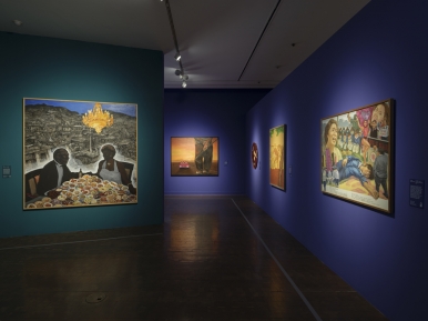 군상, 1986, 122×244cm, 패널에 종이부조, 천, 색채