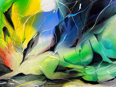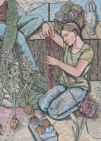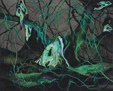 박주애는 밀도 높은 회화와 더불어, 그림을 그린 천을 이어 붙여 관람객을 품는 거대한 설치 작업을 병행한다. 빛이 투과되는 투명한 천을 바느질로 엮어내는 방식은 여성적 영역의 본능을 넘어 무한히 확장되는 생명력을 드러낸다. 작가는 캔버스 작업에서도 체모를 연상시키는 실을 늘어뜨리거나 세밀한 선으로 표정을 묘사하는 섬세함을 보이지만, 동시에 과감한 색감과 구성으로 하나의 결로 고착되지 않는 다층적인 공간을 구현하며 시각적 궤도를 이탈시킨다. 관람객은 그 안에서 나와 타자, 신체와 장소, 현실과 신화가 하나의 실체로 뒤섞이는 강렬한 유착을 목격한다.
