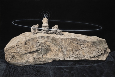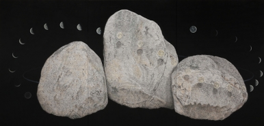 여기서 대상은 일상의 특별하지 않은 것들임에도 불구하고, 작가의 필터링을 거쳐 우주적 공백 속의 유일한 실재로 드러난다. 동시에 우주 공간의 절대적인 양을 차지하는 암흑 에너지처럼, 화면을 가득 채운 어둠은 대상을 더욱 절대적인 실재로 부상시킨다. 어둠 속에 남겨진 달이나 돌, 잡초와 같은 대상과 그 주변을 감싸는 예리한 선들은 설명할 수 없는 감각의 흐름을 감지하고 드러내는 역할을 수행한다.(「고요한 메아리」(2025), 「빛이 머문 자리」(2025)) 이로 인해 관람객은 모든 감각이 멈춘 듯한 우주적 공백 속에서, 홀로 빛나는 사물과 그 주변을 흐르는 섬세하고 예리한 시그널을 통해 작가와 같은 필드를 넘나드는 감각을 공유한다.