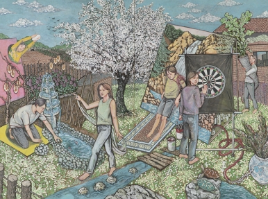 조민아는 사회의 구성원들이 각자의 자리에서 현실을 살아내는 모습과 그들이 관계 맺는 방식을 응시한다. 작가 자신을 포함한 불특정 인물들은 하나의 거대한 장면을 이루는 구성원이지만, 이들은 거대한 서사를 목표로 한 집단이기보다 각자의 일상을 영위하며 느슨한 연대를 맺고 있을 뿐이다. 분절된 존재들의 합으로 하나의 화면을 구성하는 방식은 작가가 인식하는 현대 사회의 실제 구조를 반영한다. 작가는 인물들이 소소한 일에 몰두하는 모습을 먼저 그린 뒤 계획되지 않은 어울릴법한 다른 인물들을 더해 넣는 방식을 취하는데, 이 과정에서 서로 직접적인 관계가 없던 요소들은 평면이라는 특성 안에서 더욱 자유롭게 결합하고 공존하며 효율적인 확장성을 획득한다. 작가는 이 가상의 평면에 실재로 가동될 수 있을 정도로 각종 재화와 아이템들을 촘촘히 그려넣어 <하드코딩(Hard-coding)>하듯 입력한다. 게임 화면 속의 저장소인 <인벤토리(Inventory)>와 같이 물자를 축적하거나(「넘치는 저장」(2022)) 화면 속 인물의 소소한 행위로 인해 발생하는 에너지는 효과선과 기호로 가시화되어(「Warming up」(2024)) 그림 속의 무덤덤한 표정의 인물들이 그 안에서 살아가고 있음을 증명한다.