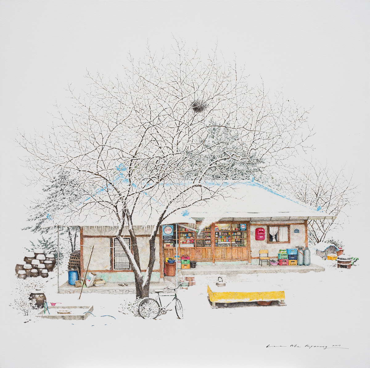 청운면에서-겨울, with a pen, use the acrylic ink on paper, 80 x 80 cm, 2018