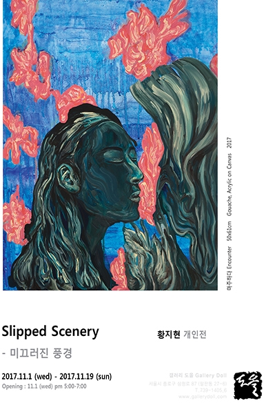 본인의 작업은 스치고 지나가는 순간들과 그 속에 변화하는 감정과 기억을 탐구하는 것이다. 단순한 현상을 기록하는 것에서 확장되어 가변적이고 이질적인 순간들을 어떻게 조형적으로 표현하는지가 작업의 중요한 지점이다. ■ 황지현 전시제목미끄러진 풍경 Slipped Scenery