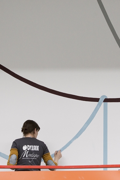 에밀리 사트르는 산책이라는 회화적 실천을 통해 벽화를 그린다. 색과 면으로 그려진 형상들이 작가의 움직임을 따라 선형적으로 이어진다. 작가의 벽화는 곧 작가가 지나간 흔적이다. 이어지고 겹쳐진 형상들은 외부의 대상을 묘사하기 위한 것이 아니라, 즉흥적이고 우연적인 방식으로 벽면들과 만나며 추상 패턴으로 구성된다. 드로잉의 구성요소들은 언뜻 기계적으로 반복되는 모양새 같아 보일 수도 있겠지만, 이들은 정밀하게 재단된 모습이라기보다는 작가의 손에 의해 일일이 그려진 형상들이다. 이는 유기적으로 이어진 흐름 안에서 작가가 수공예적으로 엮어간 흔적으로서, 작업 과정의 시간적 흐름을 담고 있다. 규칙이나 강령에 얽매이지 않고 수행적으로 이어간 드로잉의 행위와 여정, 그 순간 자체가 작품이 된다. 닫힌 결론을 보여주는 그림이 아니라 바람처럼 유영하는 드로잉은 색과 선, 덩어리에 유기체적인 생명력을 불어넣는다.
