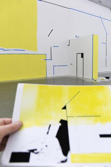 올리비에 노틀레의 벽화 공간에 들어서면 밝은 노랑의 색면과 검정 드로잉들이 주위를 환기한다. 추상의 색면과 형상을 가진 실루엣은 서로 다른 방식으로 동시에 우리에게 말을 걸어온다. 추상적 공간처럼 느껴지게 하는 거대한 노랑과 흰색의 면들 사이에서 하나의 프레임처럼 드러난 벽면에는 마치 연극무대의 주인공처럼 검정 실루엣의 형상이 등장한다. 추상적인 색면 사이로 낯설게 등장하는 검정 실루엣 형상들은 어딘지 익숙하지만 쉽게 정의내릴 수 없는 모습이다. 관람객들은 검정색 형상들을 상상의 단초로 삼아 스토리를 만들어보거나, 어디선가 본 듯한 기억을 끄집어내는 등 생각의 선을 이어나가게 된다. 작가는 이처럼 수수께끼와 같은 단서들로 관람객들을 응시와 놀이의 경험에 참여시킨다. 눈속임으로 풍경을 재현하는 방식이 아니라, 벽면 곳곳에서 관람객들의 능동적인 상상을 환기시키는 방식으로 그림을 그려내는 작가는 마치 숏과 숏 사이를 편집하는 영화감독처럼 벽면들과 공간을 하나의 거대한 프레임으로 활용한다.