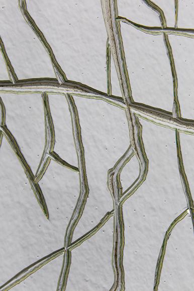 칠하고 지우고 또 칠하고 덧칠하는 클레르 콜랭-콜랭의 작업은 여전히 평면의 회화임에도 화면상에 무게감이 느껴지는 물질감을 지닌다. 이번 전시에서는 작가가 오래된 유화의 갈라진 틈을 모티프로 삼아 벽면에 균열을 낸다. 작가는 벽면에 끌개로 홈을 파내며 벽의 지층을 찾아낸다. 파내어진 벽면의 틈에는 벽의 기억과 역사가 담겨있다. 반복된 작업 속에서 벽면은 마치 주름이 생긴 피부와 같이 시간의 흔적을 축적한 벽화가 된다. 작품의 선들은 그림이 되어가는 시간을 함축하며, 외부 대상의 재현이나 묘사를 위한 도구로서의 선이 아니라, 그 자체로서 회화의 삶을 입증하는 벽화의 일부가 된다. 벽에 상처를 냄으로써 형(形)을 새기는 창조적 행위는 캔버스 프레임 안에서는 불가능한 것이며, 원시 동굴의 벽화에서와 같이 그림에 대한 인간의 원초적인 욕망을 환기시키기도 한다.