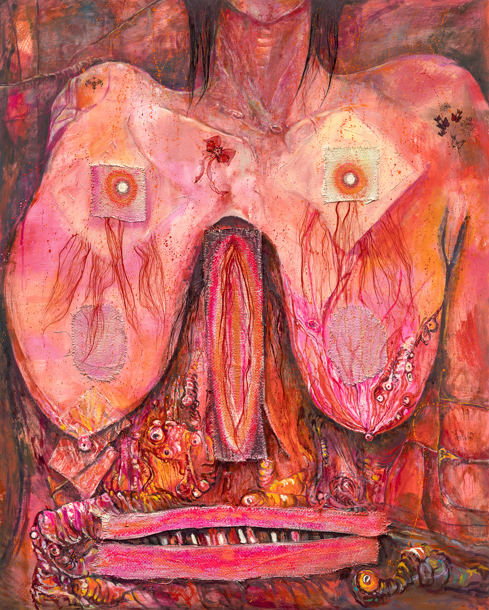 Gore Deco – Oh, Those Breasts, 2025, Oil, oil pastel, gauze, jute, human hair, transfer print on linen 162.2 x 130.3 cm Courtesy of the artist and Kukje Gallery 사진: 안천호 이미지 제공: 국제갤러리