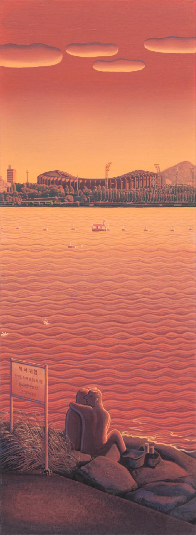Lovers at Ttukseom, 2025, acrylic and acrylic gouache on canvas, 130 × 48 cm