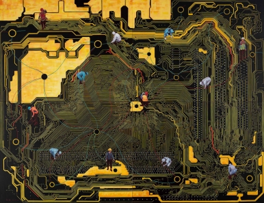 서울의 찬가II, 1993, 148×198cm, 캔버스에 흙, 먹, 아크릴릭, 기업로고 콜라주