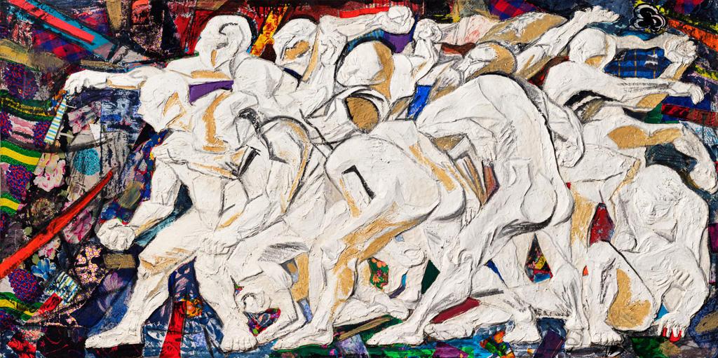 서울의 찬가II, 1993, 148×198cm, 캔버스에 흙, 먹, 아크릴릭, 기업로고 콜라주