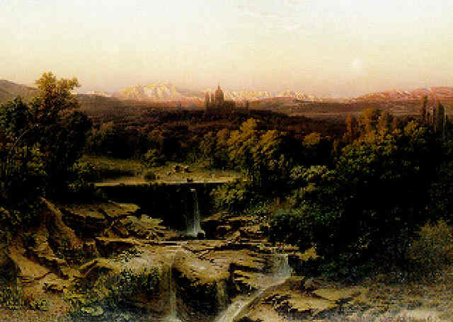 An extensive river landscape with the Escorial and the Sierra de Guadarrama Mountains beyond, oil on canvas, 131x177cm, 1859