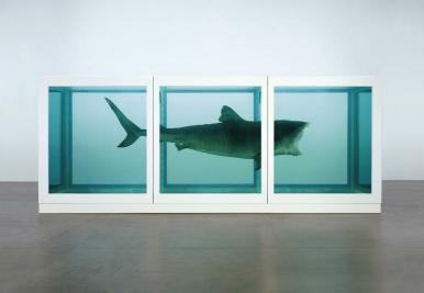 The Physical Impossibility of Death in the Mind of Someone Living, Glass, painted steel, silicone, monofilament, shark and formaldehyde solution, 2170 x 5420 x 1800 mm | 85.5 x 213.4 x 70.9 in, 1991, Damien Hirst and Science Ltd