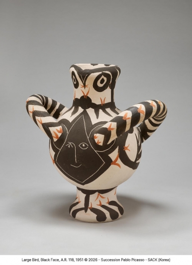 큰 새와 검은 얼굴, A.R. 118, 1951, 백토, 화장토 장식, 나이프 각인, 50×47×38cm(자료제공: 국립현대미술관)